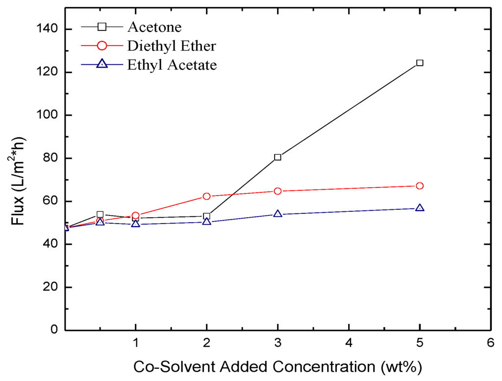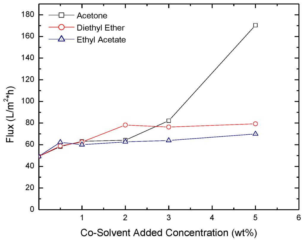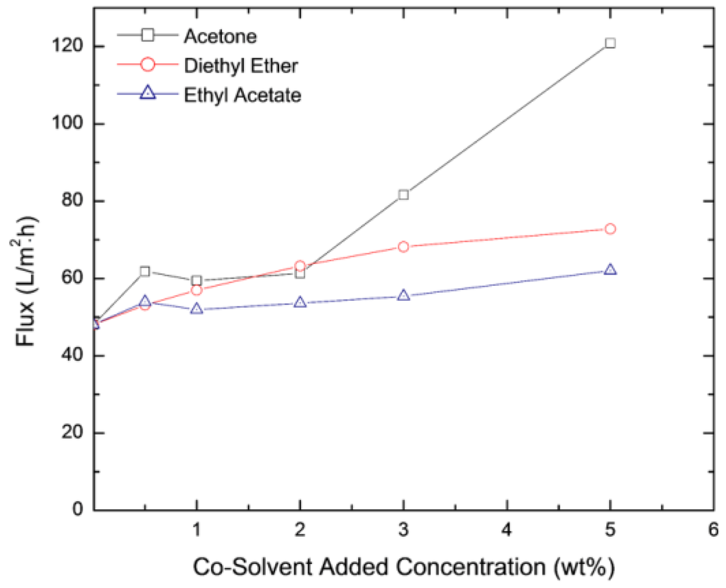 Flux of NaCl through membranes formulated with acetone, diethyl ether and ethyl acetate added as co-solvents.