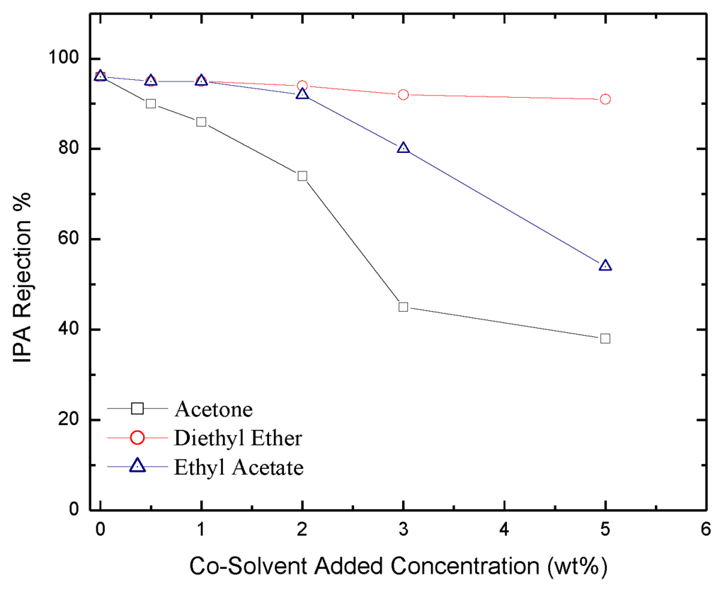 Salt rejection of IPA through membranes formulated with acetone, diethyl ether, and ethyl acetate added as co-solvents.