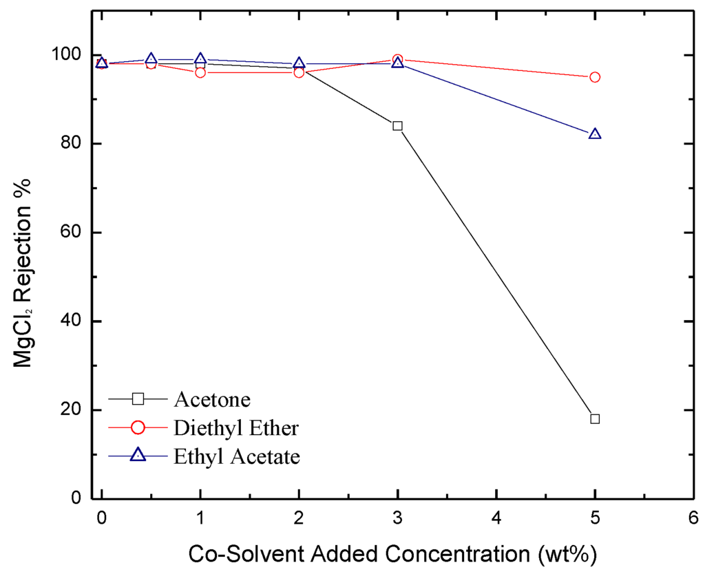 Salt rejection of MgCl2 through membranes formulated with acetone, diethyl ether, and ethyl acetate added as co-solvents.