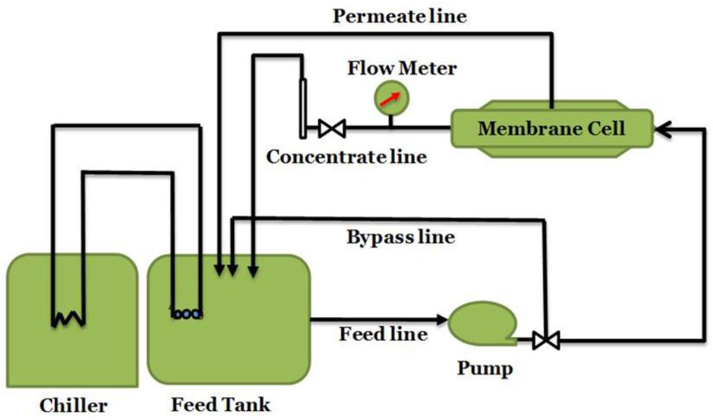 Cross-flow (flux and salt rejection). The performance of the prepared membranes was analyzed through a cross-flow system (CF042SS316 Cell, Sterlitech Corp., Kent, WA, USA). The active membrane area in this system was 42 cm2. The feed temperature was 25 °C with the pH adjusted to 6.5 ± 0.5, NaCl concentration of 2000 ppm and a flow rate of 3.8 L/min. The filtration was carried out at a transmembrane pressure of 1.6 × 106 Pa. All measurements of the water flux and salt rejection were measured after 30 min of water filtration experiments to ensure that the system was at steady state. A schematic diagram of the cross-flow filtration system is shown in Figure 13.