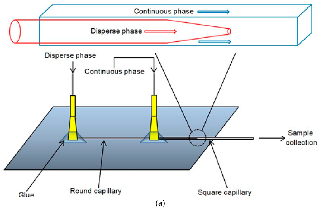 The co-flow microfluidic device (Figure 1) consisted of a 5 cm long tapered-end round capillary for supplying the organic phase, inserted in a 5 cm coaxial square capillary, which the aqueous phase flowed through. The round capillary was prepared by pulling apart a whole capillary using a Flaming-Brown type micropipette puller (P-97, Sutter Instruments, Novato, CA, USA) and then precisely rubbing the tip with sandpaper to a desired tip diameter. The tip was treated with 2-[methoxy(polyethylenoxy)propyl]trimethoxysilane to enhance the hydrophilicity of its surface. After flushing the round capillary with water and drying with compressed air, it was inserted into the square capillary, which had been glued and fixed onto a transparent glass plate. The glue used was two-component epoxy glue (ITW Devcon Ltd., Shannon, Ireland). Two needles (PrecisionGlide 305175, Becton Dickinson and Company, Franklin Lakes, NJ, USA), which were cut to remove the sharp tips, were positioned and glued, one at the end of the round capillary and another at the junction of the two capillaries. The device was tested by running water through each needle to ensure that no leaking or blocking was present.