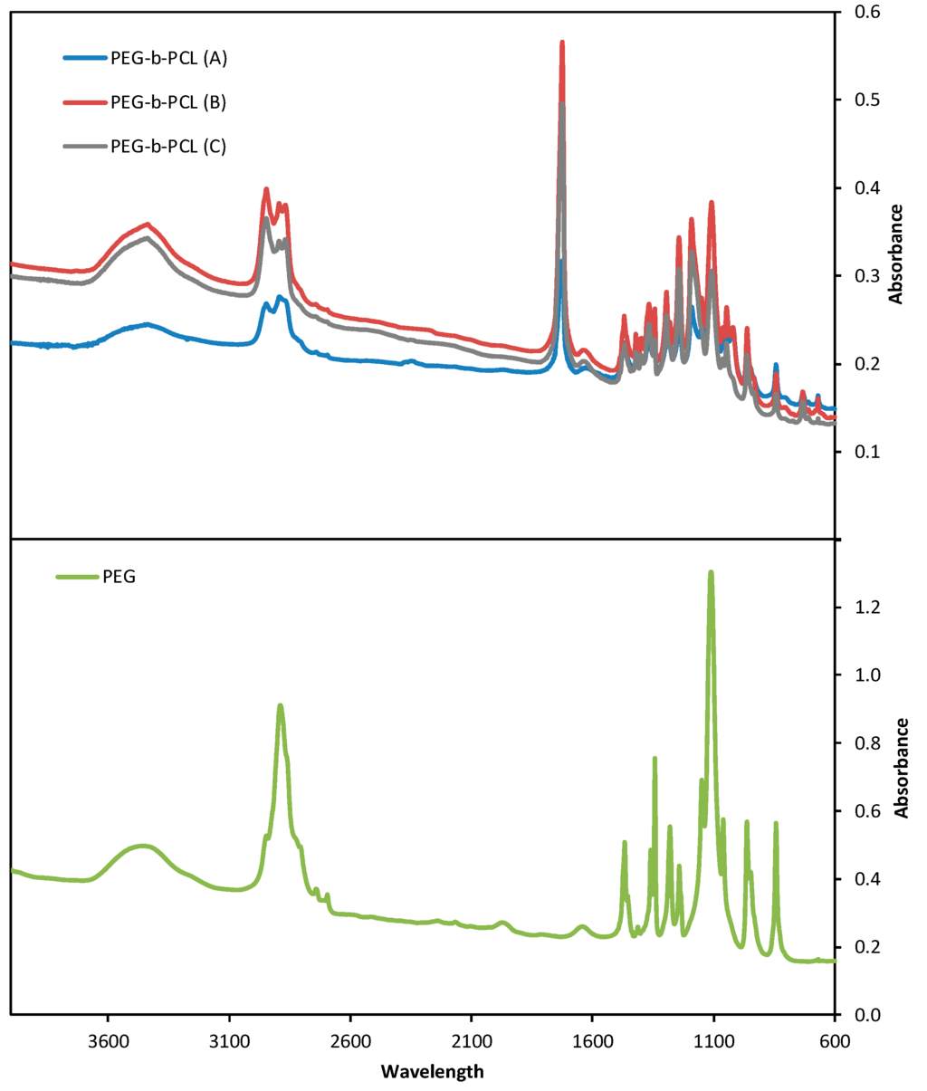 Fourier Transformed Infrared Spectroscopy (FTIR) spectra are shown in Figure 3. FTIR spectra were obtained using a Shimadzu FTIR-8400S spectrometer. A small amount of each material was mixed with KBr and compressed to tablets. The IR spectra of these tablets were obtained in absorbance mode and in the spectral region of 600–4000 cm−1 using a resolution of 4 cm−1 and 64 co-added scans. All materials show characteristic absorptions for PEG, the C-O-C etheric bond bending vibration at 1109 cm−1 and the absorptions at 842 and 1333 cm−1, attributed to PEG crystalline regions. On the PEG-b-PCL spectra, new absorptions emerge: one at 1724 cm−1 is attributed to stretching of the esteric carbonyl, while the two at 2935 and 729 cm−1 are due to C-H bond stretching in the PCL block. Absorptions attributed to the PCL block increase in intensity from PEG-b-PCL (A) to PEG-b-PCL (C) to PEG-b-PCL (B), as the molecular weight of the hydrophobic block increases, respectively.