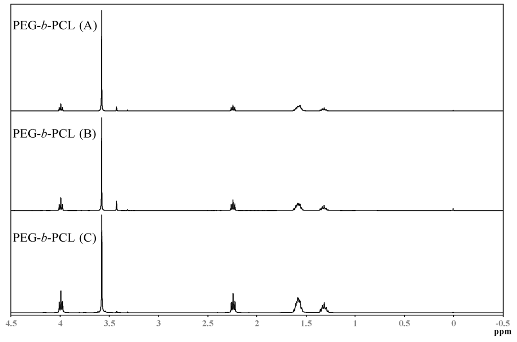 Spectra from Nuclear Magnetic Resonance Spectroscopy (1H-NMR) are shown in Figure 4. NMR spectra were obtained on a JEOL-ECS-400 NMR spectrometer operating at 400.13 MHz for protons, employing a 5 mm high-resolution broad-band gradients probe. Spectra were recorded using the “single-pulse” pulse program with P90 = 10.4 μs covering a sweep width 25.0 ppm (8278 Hz) with 32,000 time domain data points giving an acquisition time of 3.95 s, Fourier transformed using 64,000 data points and referenced to an internal TMS standard at 0.0 ppm. Absorbencies at 4.0 and 2.3 ppm are due to protons in the PCL block, while the absorbance at 3.3 ppm is due to the three protons in the methoxy terminal-group of PEG. The absorbance of the PCL block increases in intensity when the hydrophobic block increases, respectively.