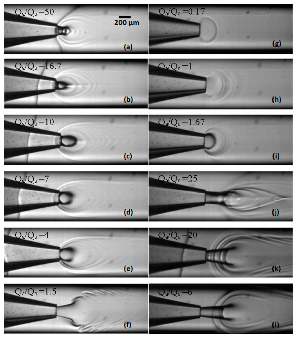 - Utada, A.S.; Fernandez-Nieves, A.; Stone, H.A.; Weitz, D.A. Dripping to jetting transitions in coflowing liquid streams. Phys. Rev. Lett. 2007, 99, 094502. [Google Scholar] [CrossRef] [PubMed]