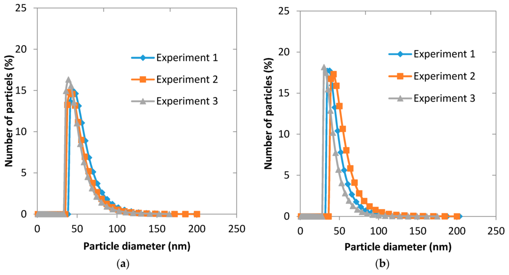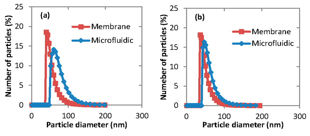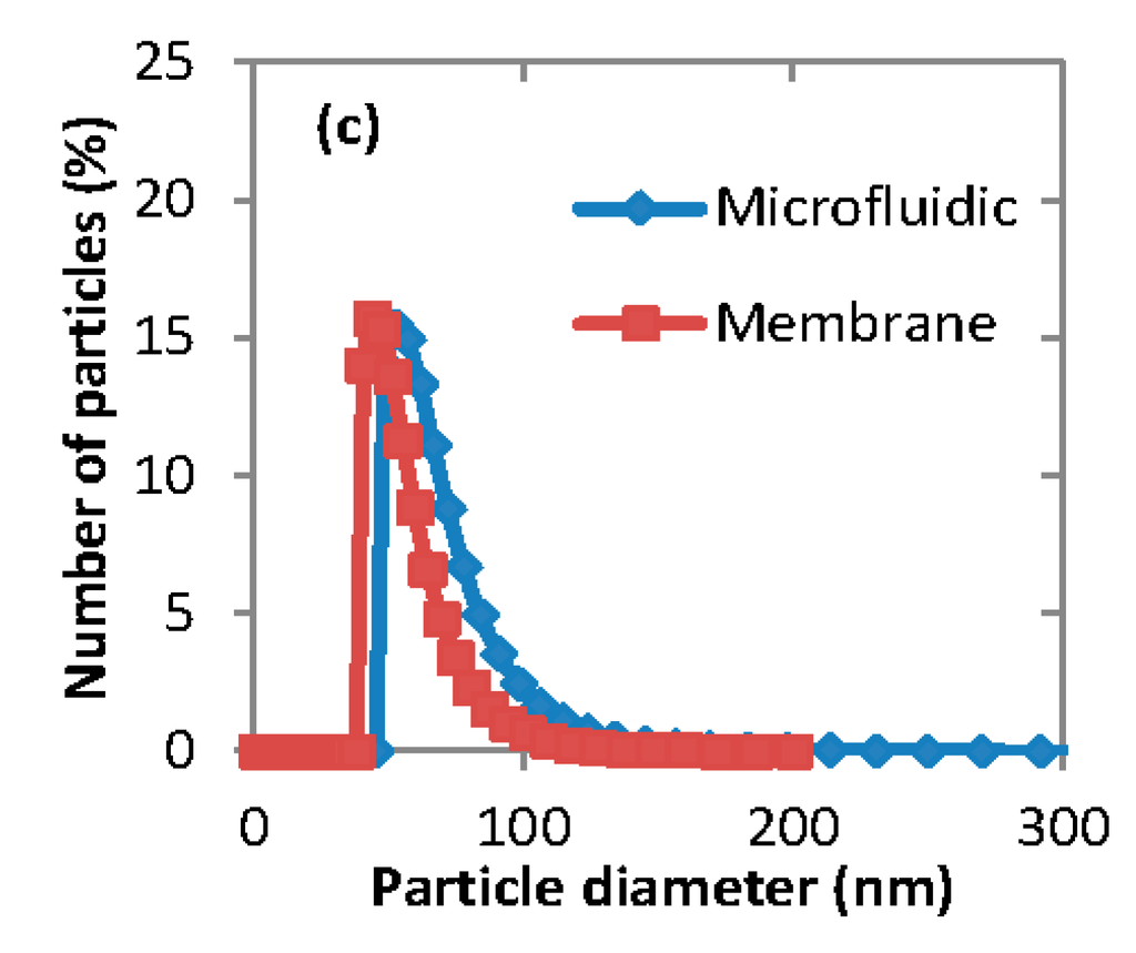 The experiments conducted under a certain set of conditions were repeated three times in order to estimate reproducibility of the fabrication process. The conditions for microfluidic experiments were: Qa = 5 mL·h−1, Qo = 1.25 mL·h−1 (Qa/Qo = 4) and the conditions for membrane device were: Vo = 5 mL, Vw = 25 mL. The organic phase solution for both devices was 1 mg·mL−1 of the copolymer PEG-b-PCL (B) dissolved in acetone.