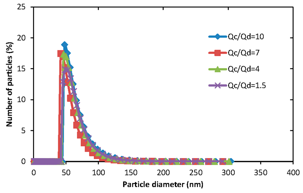 Figure 8 shows the particle size distribution for micelles generated from the same co-flow microfluidic device under different aqueous/organic volume ratio. These illustrate that there are no significant differences of particles diameters among different Qa/Qo values. Laouini et al. [21] found that the diameter of micelles generated from membrane device uniformly decreased when increasing the aqueous/organic phase ratio.