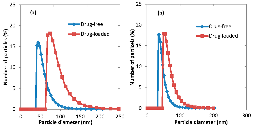 Table 2 shows the mean size of polymeric micelles from three different copolymers, two producing techniques, and two organic solvents. Polydispersity index (PDI) is a measure of broadness of particle size distribution. It can be seen that no significant difference in the micelle size was observed using different copolymers.