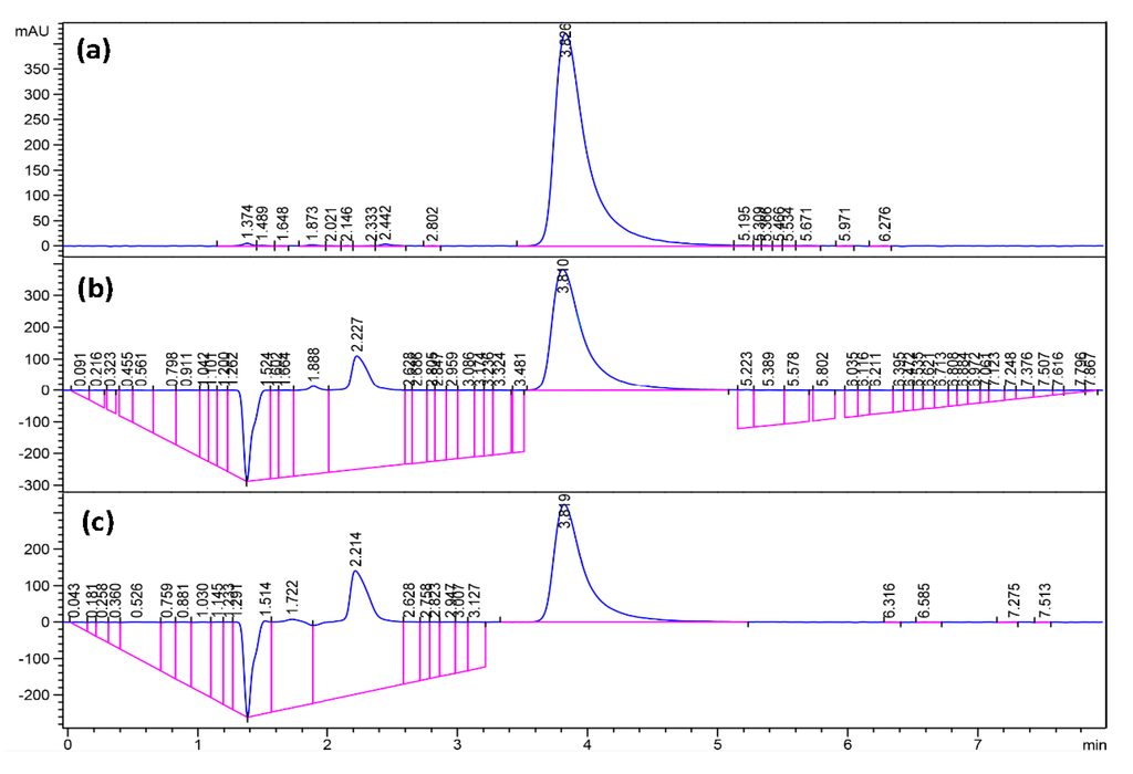 High-performance liquid chromatography (HPLC) analysis of: (a) known concentration of 0.5 mg·mL−1 of fluconazole for calibration; (b) supernatant of drug-loaded micelles using PEG-b-PCL (B) after 48 h; and (c) supernatant of drug-loaded micelles using PEG-b-PCL (C) after 48 h.