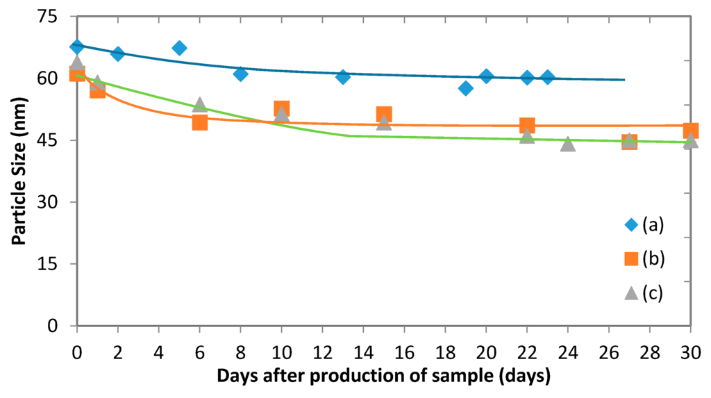 (a) The change in average particle size of micelles during storage: (a) Drug-free micelles produced in microfluidic device at Qa = 5 mL·h−1 and Qo = 0.71 mL·h−1. The organic phase was 1 mg·mL−1 PEG-b-PCL (B) in THF; (b) Drug-loaded micelles produced using membrane device. The fluconazole content in the organic phase was 0.4 mg·mL−1 per 1 mg·mL−1 PEG-b-PCL (A); (c) Drug-loaded micelles produced using membrane device. The fluconazole content in the organic phase was 0.4 mg·mL−1 per 1 mg·mL−1 PEG-b-PCL (B).
