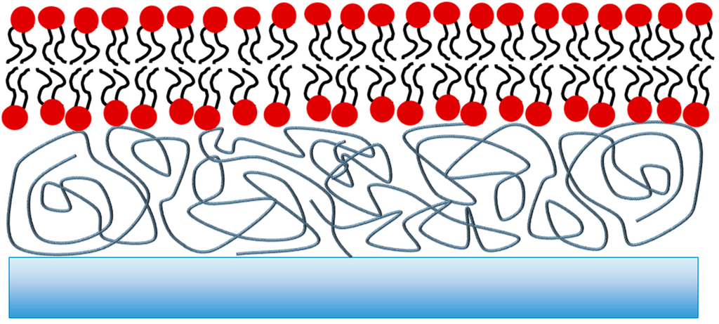 To reduce membrane-substrate interactions, the bilayer can be separated from the support by the introduction of a polymer layer (Figure 2) [11,23]. This layer is typically bound to the surface of the support material first and the lipid bilayer is subsequently deposited onto the polymer cushion. The cushion, if appropriately designed, can also mimic the cytoskeleton of a cell. However, the sub-membrane reservoir thickness depends on the polydispersity of the polymer used as well as its swelling behaviour upon hydration. Both factors are difficult to control with absolute precision and therefore the resulting bilayers have been shown to often contain holes and defects, making polymer-supported bilayers generally less favourable to be used as biosensing platforms [24,25].