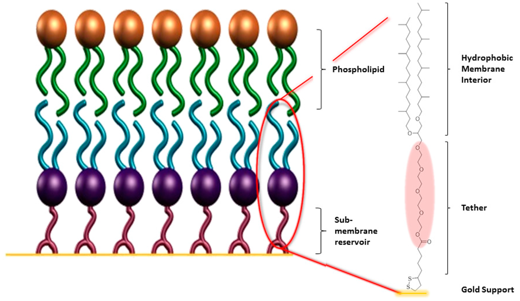 The chemical nature of the sub-membrane space has a significant impact on both the structure of the lipid bilayer as well as the functional incorporation of membrane components. Physical parameters such as bilayer impedance [40], bilayer fluidity [45], and hydration of the sub-membrane space [61,62] have been used to characterise different tBLM architectures. Ideally, and in order to mimic a natural membrane, a tBLM should have a high electrical impedance, a low capacitance, as well as high fluidity and high sub-membrane hydration. The electrical properties ensure that ion transport across the membrane is mainly due to the function of embedded protein or peptides, while the hydration is essential to allow for protein function. However, increases in membrane hydration and fluidity are generally accompanied by a reduction of the electrical sealing properties, resulting from a higher defect density [61,63]. The sub-membrane space of a tBLM is dominated by the structure of the tether-segment of the anchorlipid and the anchoring group itself, which is responsible for grafting the lipid onto the solid support.