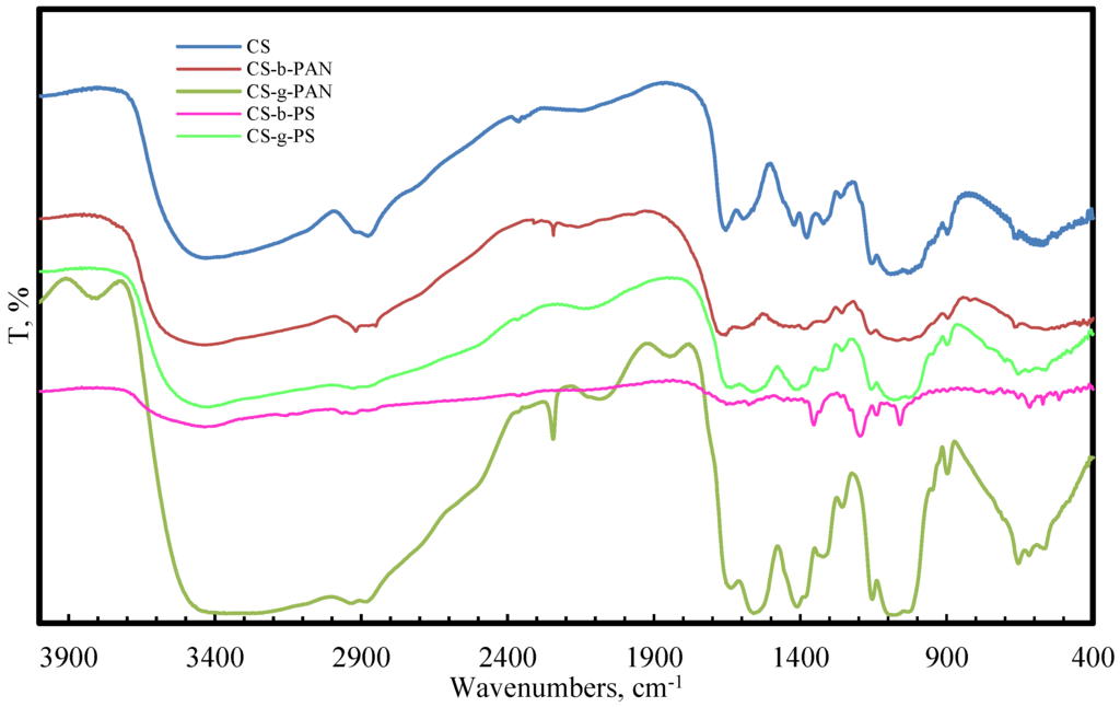 FTIR spectra of pure CS, CS-PAN copolymers, and CS-PS copolymers.