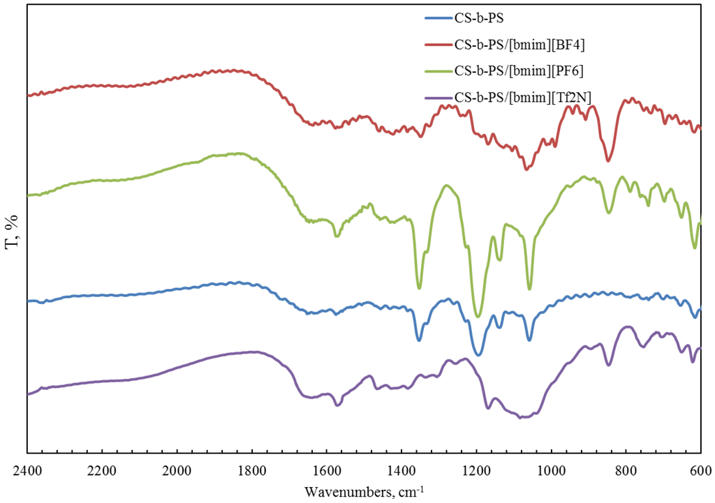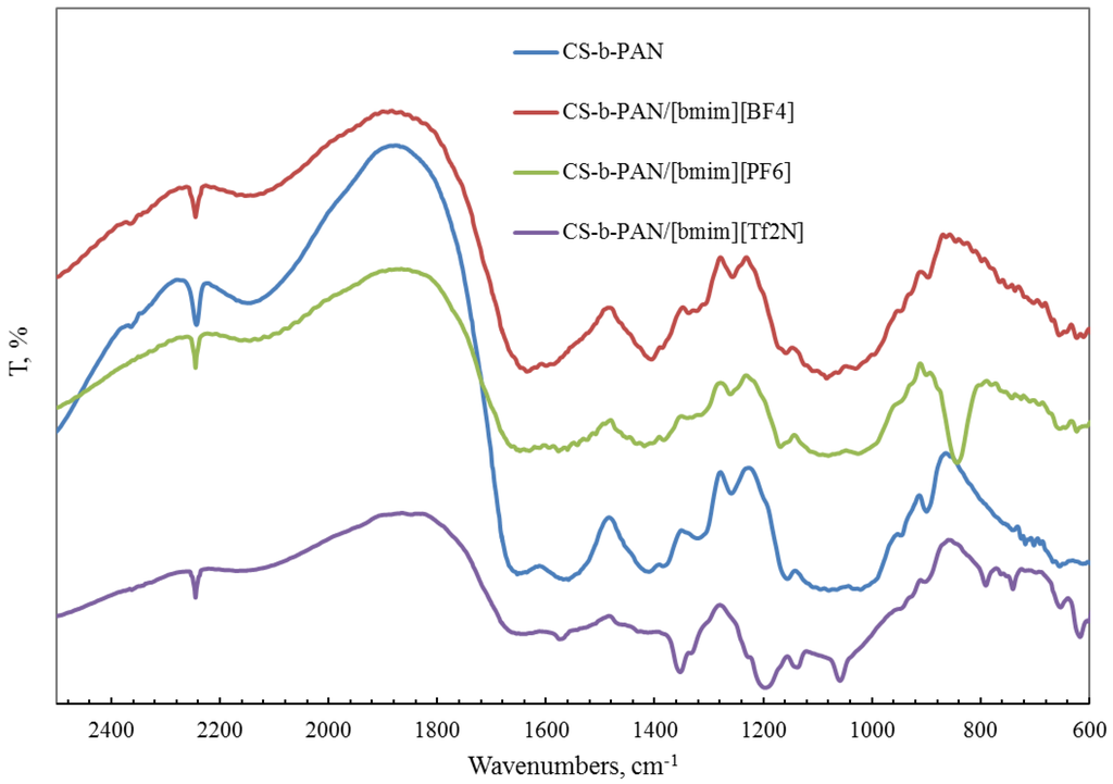 FTIR spectroscopy was also used for the characterization of a copolymer–ionic liquid interaction. The obtained spectra of chitosan block copolymer with poly(acrylonitrile) (CS-b-PAN) doped with ionic liquids (IL), chitosan graft copolymer with poly(acrylonitrile) (CS-g-PAN) doped with IL, chitosan block copolymer with poly(styrene) (CS-b-PS) doped with IL, and chitosan graft copolymer with poly(styrene) (CS-g-PS) doped with IL are shown in Figure 2, Figure 3, Figure 4 and Figure 5.
