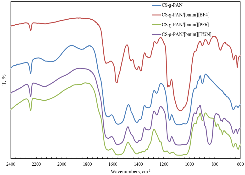FTIR spectra of pure CS-g-PAN copolymer and CS-g-PAN copolymers doped with IL.