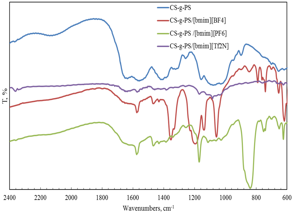 FTIR spectra of pure CS-g-PS copolymer and CS-g-PS copolymers doped with IL.