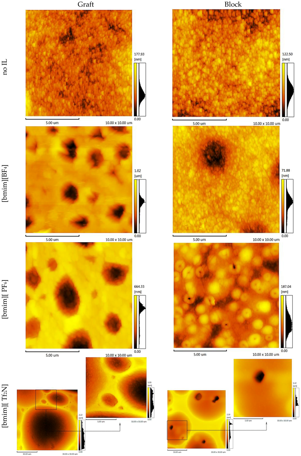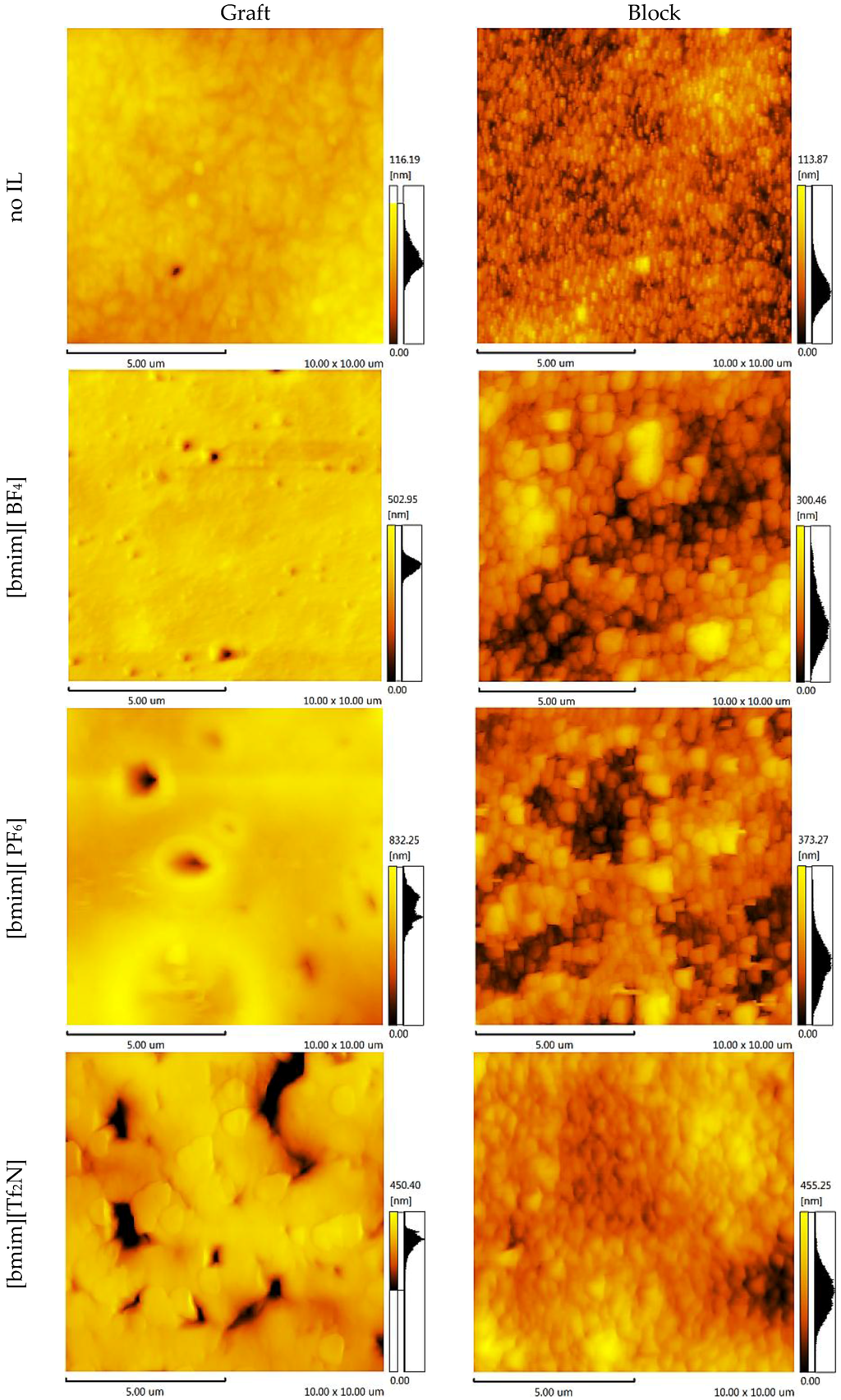 Despite IL doping yielding a different influence on CS-PAN and CS-PS copolymer surfaces, generally, the incorporation of the ionic liquids in the copolymer matrix causes the formation of an explicit macro-relief, thus, the nodular structure remains in those samples at the micro level. The specific impact of [bmim][BF4] and [bmim][PF6] on the surface structure is more pronounced for CS-PAN then for CS-PS. This is likely related to the fact that PAN polymer chain mobility is higher than PS. For the same reason, block copolymers are more resistant to the effects of IL doping in comparison to graft copolymers. The IL [bmim][Tf2N] has the greatest influence on the copolymer structure due to the more sterically demanding anion. The nodule surface structure may be related to a particular orientation of macrochain fragments when forming a film. Similar macro-chains twist, forming areas of various chemical natures. The effects of the monomer units’ polarity and the IL hydrophilic/hydrophobic properties on IL distribution between macromolecular chains are far from trivial and should not be ignored.
