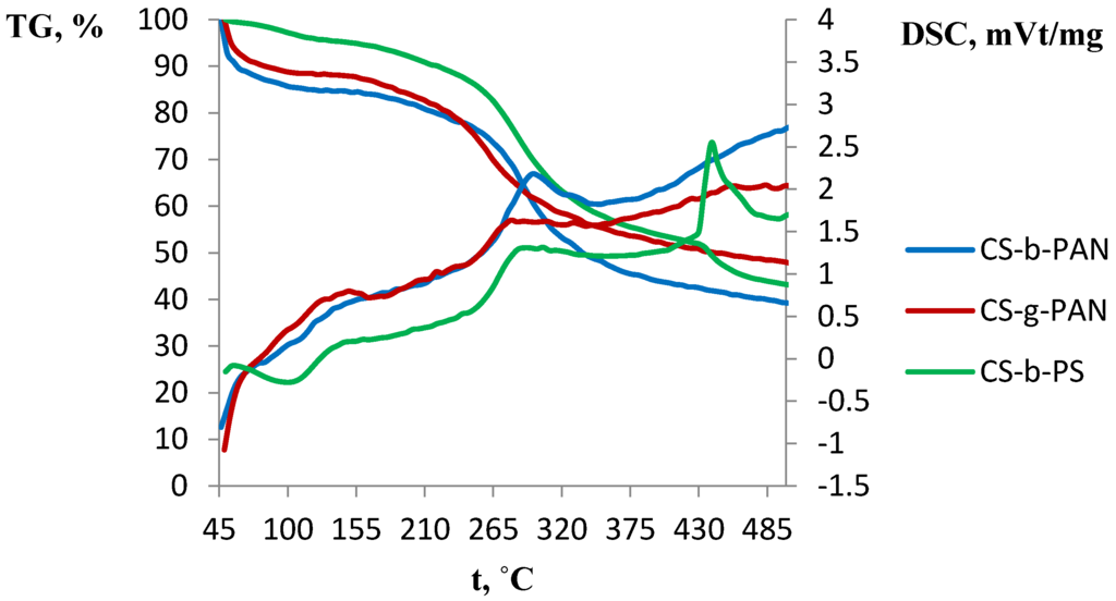 DSC and TGA curves of CS-g-PAN, CS-b-PAN, and CS-b-PS copolymers.