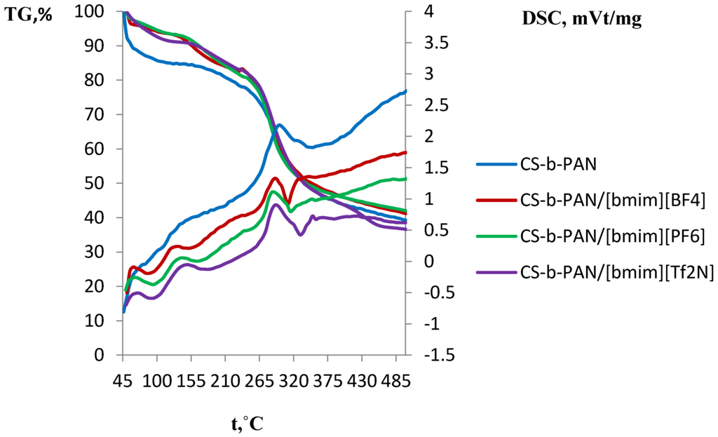 DSC and TGA curves of CS-b-PAN, CS-b-PAN/[bmim][BF4], CS-b-PAN/[bmim][PF6], and CS-b-PAN/[bmim][Tf2N] copolymers.