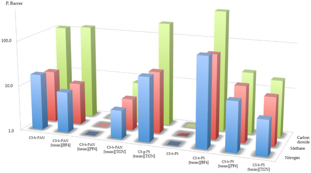 The aforementioned examples of separation by materials doped with IL were promising for carbon dioxide separation; unfortunately, some of the synthesized copolymers were unable to be used in permeability tests. With the exception of CS-g-PST doped by [bmim][Tf2N], all graft copolymers were destroyed under increased pressure. The values of the obtained permeability coefficients for these experiments are presented in Figure 10, and the obtained results are compared with data discussed in the introduction [11,12,13,14,15,16,17,18]. The selectivity values presented in Table 3 are roughly the same for carbon dioxide/methane and carbon dioxide/nitrogen systems. As shown here, only block-copolymers which were doped with IL were permeable for carbon dioxide, methane, and nitrogen gases lower permeability in the current experiments. The most permeable film was made of CS-b-PS with [bmim][PF6]. This observation leads us to conclude that the permeability data has a correlation with data obtained from AFM measurements presented in Figure 6 and Figure 7. For CS-b-PAN doped by IL, the permeability and selectivity were increased in the following order [bmim][Tf2N] < [no IL] < [bmim][BF4]. For CS-b-PS, the permeability and selectivity increases in the order of the following IL: [bmim][Tf2N] < [bmim][PF6] < [bmim][BF4]. This is evidence that the value of solubility of carbon dioxide is affected vice versa to the permeability of mass-transfer mechanism.