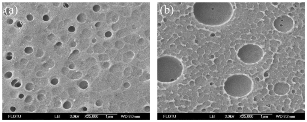 The surface and cross-section morphologies of PPSU membranes were observed by scanning electron microscope (JEOL, JSM-7401F, Tokyo, Japan) using an acceleration voltage of 3.0 kV. For this purpose, the membranes were frozen in liquid nitrogen and then broken into pieces, which were transferred into the microscope chamber with a sample holder after sputtering with gold as the conductive material.