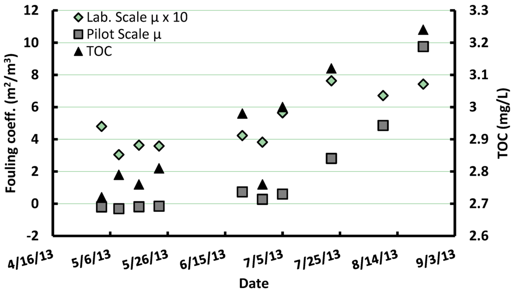 Comparison of lab-scale (1 fiber) and pilot polymeric membrane (w/o pretreatment) total fouling coefficients along with settled water Total Organic Carbon (TOC) concentration variations from May to September 2013.