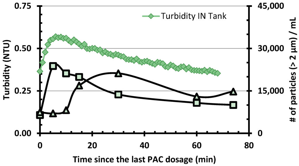 A test was conducted in order to assess the release of PAC fines from the carbon contactor by collecting samples at different times following one of the periodic PAC dosage in the CC. Two different locations (cf. Figure 1) were sampled: (i) after the CC micro-strainer (i.e., the effluent of the CC contactor) and (ii) on the feed line ahead of a membrane. Particle counts (DPA4000, Brightwell Technologies, Ottawa, ON, CAN) were enumerated at 400X magnification on those samples to evaluate if PAC was effectively exported from the CC to the membranes.