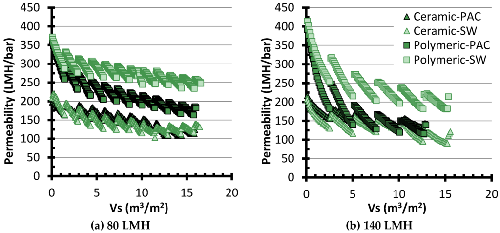 Figure 4 presents typical permeability monitoring data for the assays conducted at 80 and 140 LMH. For one given membrane, each individual slope represents 24 cycles of operation (or 18 h), followed by a CEB, which results in the sudden permeability recovery. From these data, it is apparent that, although the ceramic membrane system had a lower initial permeability, its permeability remained more stable than for the polymeric membrane. Additionally, the polymeric membrane system was negatively impacted by the PAC pretreatment, most likely due to the export of fines. Further analysis of the entire dataset using the concept of fouling coefficient is presented in the following sections.