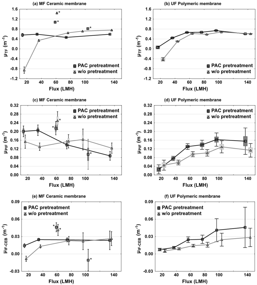 Fouling coefficients of MF ceramic membranes (a,c,e) and UF polymeric membranes (b,d,f) fed with and without PAC pretreated water (black and grey distributions respectively). Markers indicate arithmetic means, boxes represent standard errors and whiskers illustrate the 95% confidence interval. * indicate the three outlier conditions due to improper CIP.