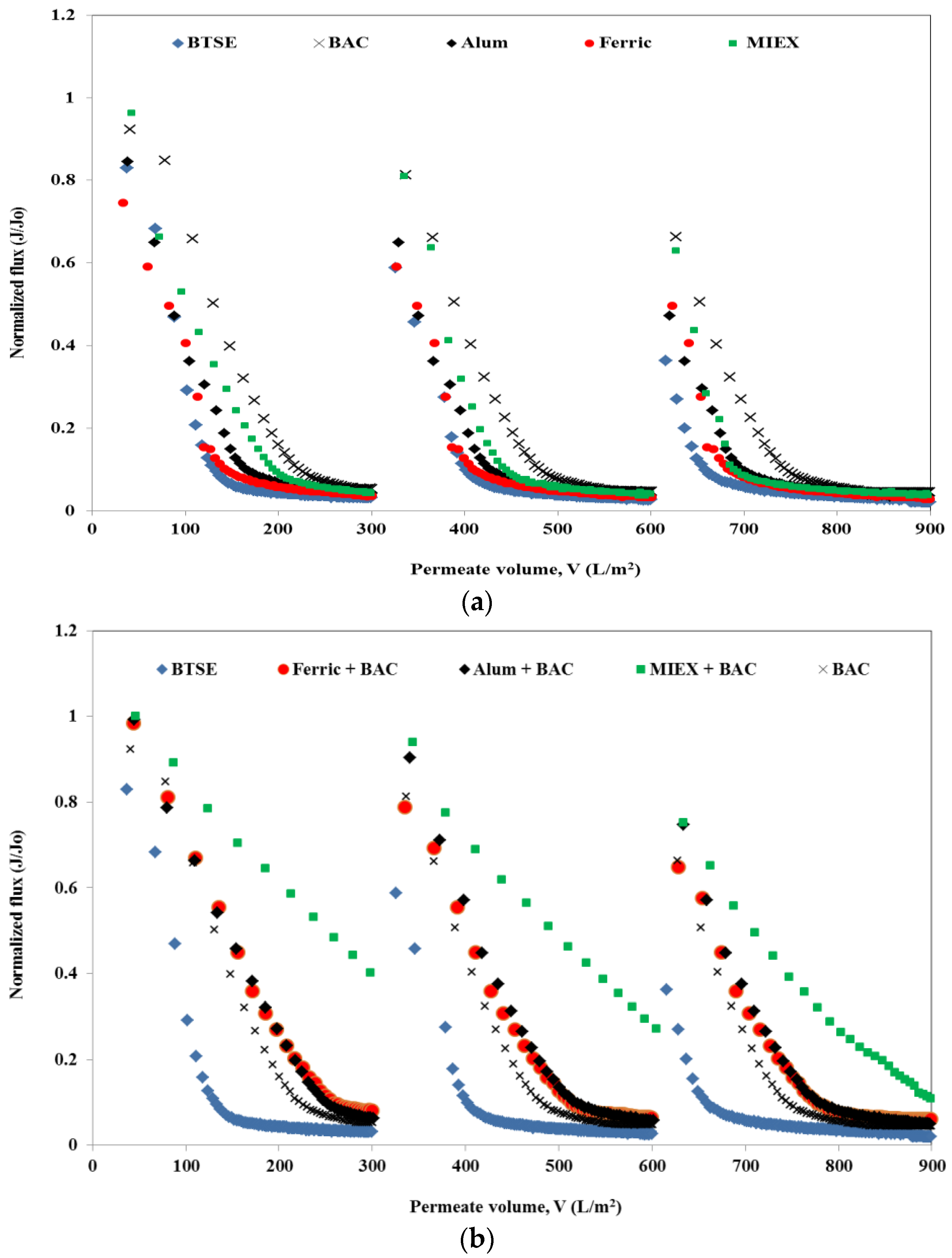 The unified membrane fouling index (UMFI) values for total fouling for the different treatments were determined after filtration cycle 1. Using the relationship developed by Huang et al. [31], whereby the UMFI can be calculated from the linear fitting of Jo/J versus specific volume (V), the values for after the various treatments were determined. A higher UMFI value generally indicates greater total membrane fouling. Ferric chloride gave less reduction in UMFI than the alum treatment, which gave less than the MIEX treatment (Figure 3). BAC led to 42% reduction in UMFI, i.e., slightly greater than MIEX treatment, which, in turn, was greater than for coagulation.