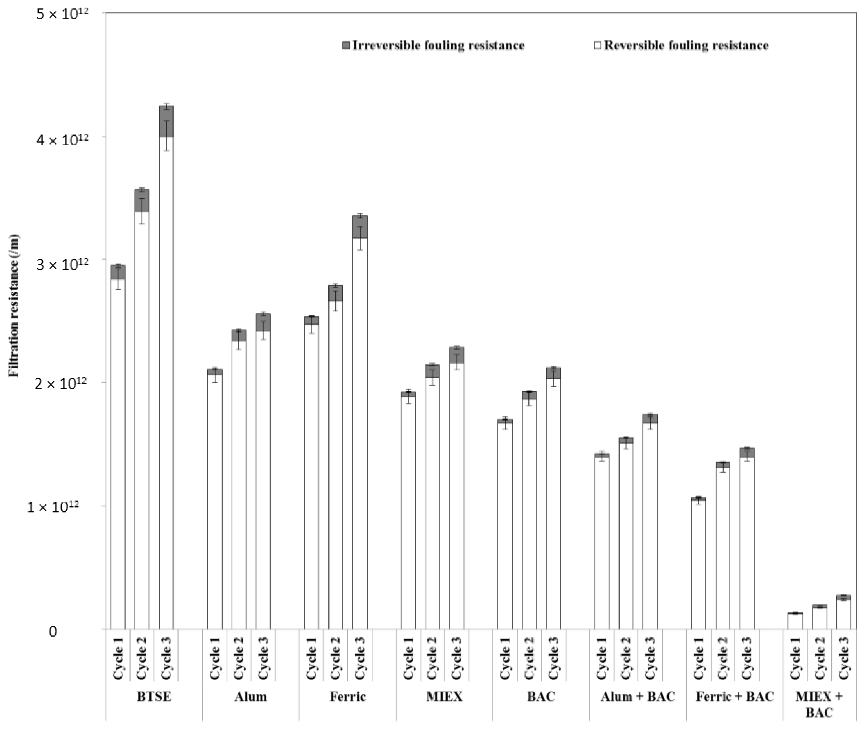 Both reversible and irreversible resistance were decreased markedly after pre-treatment of the feedwater (Figure 2). The reduction after BAC was greater than after the MIEX or coagulation processes. BAC led to a larger reduction in irreversible (73%) than reversible fouling resistance (41%), indicating a decrease in pore blocking and/or pore adsorption of the membranes. The reduction in hydraulically reversible fouling was greater after MIEX than alum treatment, which, in turn, was greater than that after ferric chloride coagulation. Although MIEX and alum gave similar performance in reducing the irreversible fouling, MIEX led to a greater improvement in flux. This was likely due to greater reduction in reversible fouling resistance as it contributed more than 90% of the total filtration resistance. The sequence of MIEX or coagulation followed by BAC treatment gave greater reduction of hydraulically reversible and irreversible fouling resistance than the standalone treatments, and MIEX followed by BAC gave greater reduction of both fouling resistances. With successive filtration cycles, the reversible and irreversible fouling resistance increased for all treatments, with high resistance being correlated with low flux.