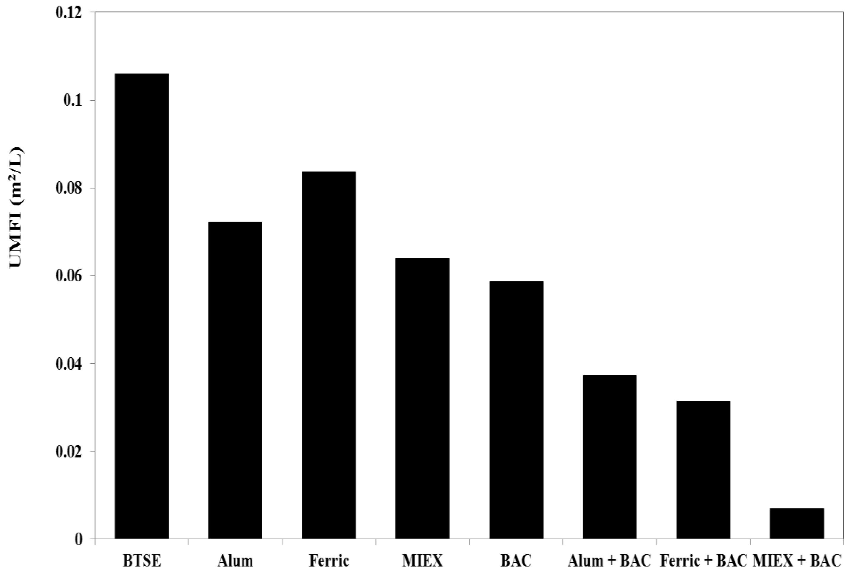 Consistent with the flux and filtration resistance, there was a marked reduction in total fouling for the sequential treatment processes. The decrease in UMFI was 65%, 70% and 93% for alum, ferric chloride and MIEX, respectively, when combined with BAC treatment, clearly demonstrating that MIEX pre-treatment led to greater reduction in UMFI than coagulation followed by BAC treatment.