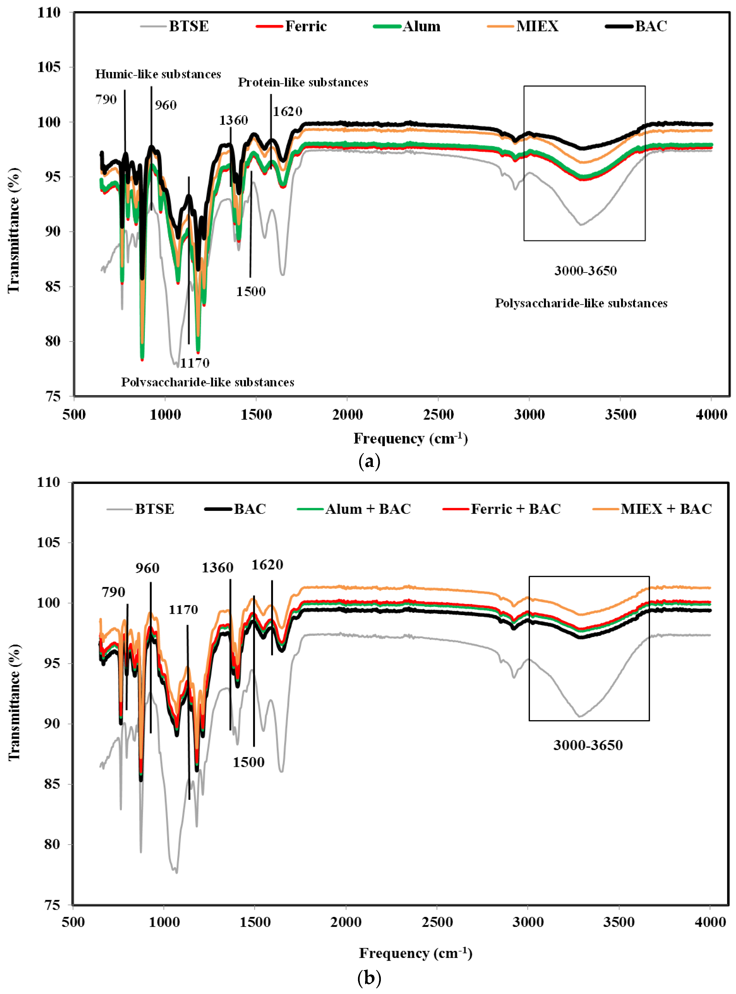 The transmittance at the assigned bands was significantly lower for the combinations of coagulation or MIEX with BAC treatment than the standalone processes (Figure 4b), indicating that the sequential treatment process was more effective for removing the organic matter resulting in less deposition of organics on the surface of the MF membrane. MIEX followed by BAC treatment led to lower rejection of these organics compared with the BAC followed by coagulation treatment, consistent with the lower degree of fouling.