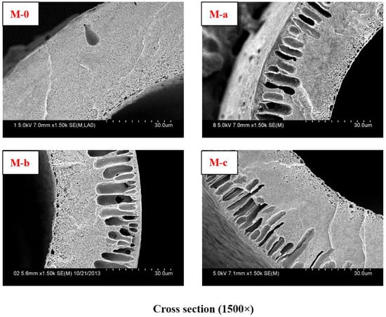 Cross-sectional SEM micrographs with different PVP molecular weights in membranes. The cross-sectional SEM micrograph of Virgin PVDF membrane is M-0. The cross-sectional SEM micrographs of modified PVDF membranes are M-a, M-b, and M-c with PVP molecular weights 6 KDa, 10 KDa, and 30 KDa, respectively.