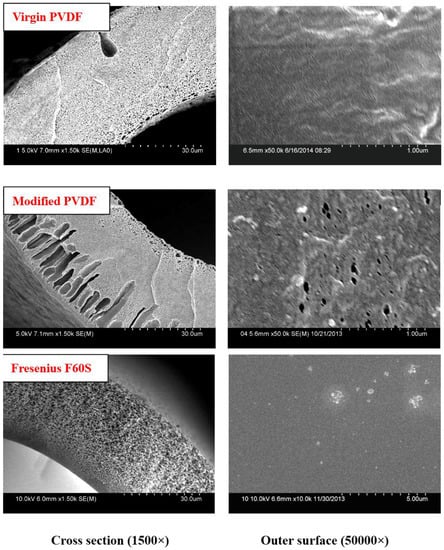 The Cross-section and outer surface SEM micrographs of PVDF and Fresenius F60S membrane are shown in Figure 5. There are no finger-like pores in virgin PVDF and Fresenius F60S membranes. The virgin PVDF membrane is M-0 without PVP. The modified PVDF membrane exhibits more finger-like pores than PVDF membrane.