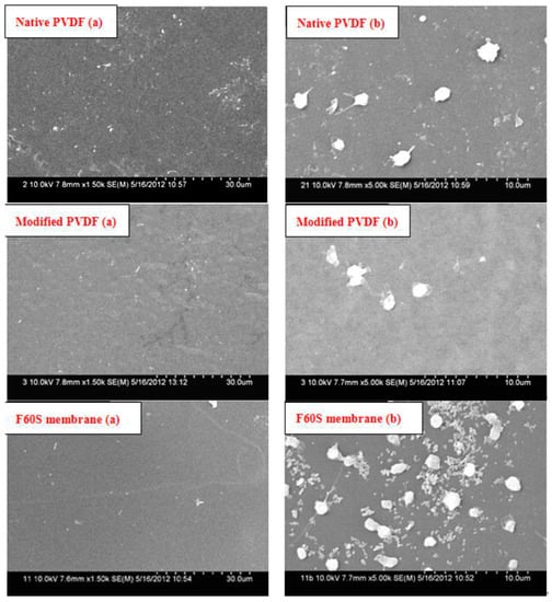 The virgin and modified PVDF membranes have better mechanical performance than Fresenius F60S membrane. The PVDF membranes and Fresenius F60S membrane have different mechanical performance, which mainly depends on the different materials and different cross-sectional structures (Figure 5). The modified PVDF membrane exhibits more finger-like pores than PVDF membrane. There are two reasons for that. One is that PVP and PEG have different compatibility with PVDF polymer (δ PVDF = 21.7, δ PEG6000 = 22.4 [20], δ PVP = 32.5 [21]). PEG has a better compatibility with PVDF than PVP. Second is the different molecular weight between PEG and PVP. High molecular weight additive is more conducive to forming larger pores. The modified PVDF membrane has higher UF flux and LZM passage than virgin PVDF membrane. That can be explained by the different molecular weight of additives. PEG (6 KDa) has higher solubility than high molecular weight PVP (30 KDa) and, therefore, it can be washed out together with the solvent from membranes to the coagulation bath. However, the higher molecular weight additives are difficult to flow from membranes. There are more additives staying in membranes. PVP is a hydrophilicity polymer, which can increase the hydrophilicity of modified PVDF membrane (38°). At the same time, there are more open pores on the surface of modified PVDF membrane, which can also increase the UF flux and LZM passage. Compared with Fresenius F60S membrane, the modified PVDF membrane has higher UF flux and LZM passage while worse rejection of BSA than Fresenius F60S membrane. The reason for that can be explained by the appropriate morphology and the higher hydrophilicity of modified PVDF membrane.