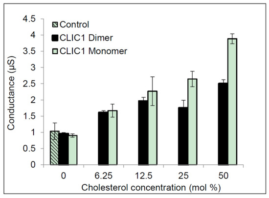 Conductance of CLIC1 in tBLMs containing varying amounts of cholesterol. 20 µg of CLIC1 oxidised dimer was pre-incubated with 2 mM H2O2; 20 µg of CLIC1 reduced monomer was pre-incubated with 0.5 mM TCEP in 100 µL of HEPES/KCl buffer (pH 6.5) prior to adding to tethered bilayer membranes containing 0, 6.25, 12.5, 25 and 50 mol % cholesterol concentrations. Control is membrane with 0 mol % cholesterol containing 100 µL HEPES/KCl buffer (pH 6.5) with no protein added. The error bars represent the standard error of three independent impedance spectroscopy conductance measurements (n = 3).