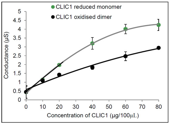 Conductance of different concentrations of CLIC1 in tBLMs containing 25 mol % cholesterol. Concentrations of 0, 10, 20, 40 and 60 µg of CLIC1 reduced monomer (pre-incubated with 0.5 mM TCEP) and CLIC1 oxidised dimer (pre-incubated with H2O2) in 100 µL of HEPES/KCl buffer (pH 6.5) were added into membranes containing 25 mol % cholesterol where the conductance was measured and linear fitting (as indicated in black for CLIC1 reduced monomer and red for oxidised dimeric CLIC1) and quadratic polynomial fits were generated using Microsoft Excel 2010 (y = −0.0005x2 + 0.0924x + 0.3639, R2 = 0.9985 for CLIC1 monomer and y = −0.0001x2 + 0.0399x + 0.5761, R2 = 0.9857). The error bars represent the standard error of three experimental repeats (n = 3).
