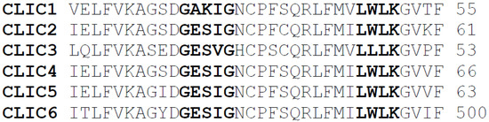 Amino Acid Sequence Alignment of Human CLIC proteins showing the CRAC motif. Highlighted in red is the GXXXG motif and in Green highlighted the LWLK motif in human CLICs. CLIC1 (accession number: CAG46868.1), CLIC2 (accession number: CAA03948.1), CLIC3 (accession number: NP_004660.2), CLIC4 (accession number: CAG38532.1), CLIC5 (accession number: AAF66928.1), CLIC6 (accession number: NP_444507.1). The alignment was produced using Clustalw.