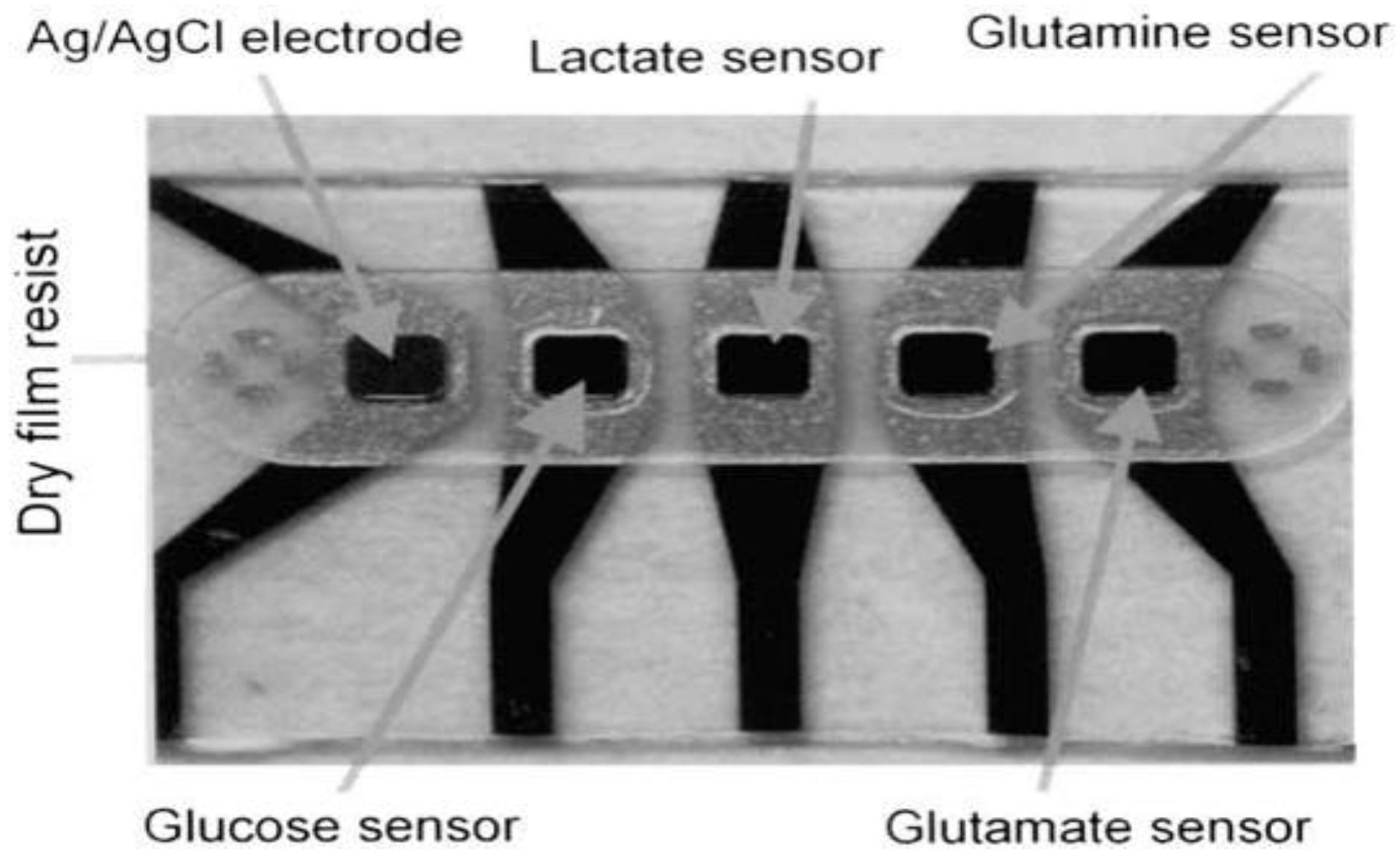 - Moser, I.; Jobst, G.; Urban, G.A. Biosensor arrays for simultaneous measurement of glucose, lactate, glutamate, and glutamine. Biosens. Bioelectron. 2002, 17, 297–302. [Google Scholar] [CrossRef]
