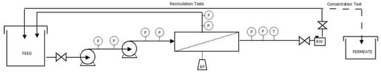 Scheme of the pilot filtration unit with cleaning devices (BP—Backpulse and BW—Backwash) used to treat the real olive mill wastewater in different operation modes (recirculation and concentration tests).