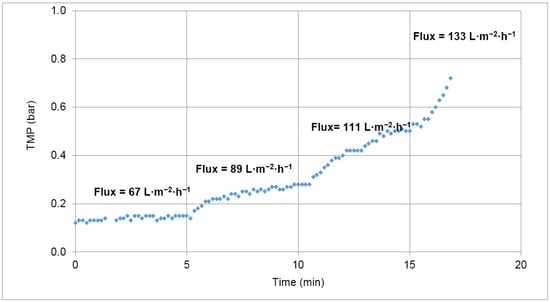 Figure 2 shows the TMP increasing with the permeate flux variation. Due to limitations of the system used, it was not possible to test fluxes lower than 67 L·m−2·h−1. Although some fouling was observed in each step, resulting in TMP increase in all of them, the value of 67 L·m−2·h−1 was the chosen permeate flux to initiate the tests since at this permeate flux the lowest TMP increase was observed.