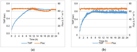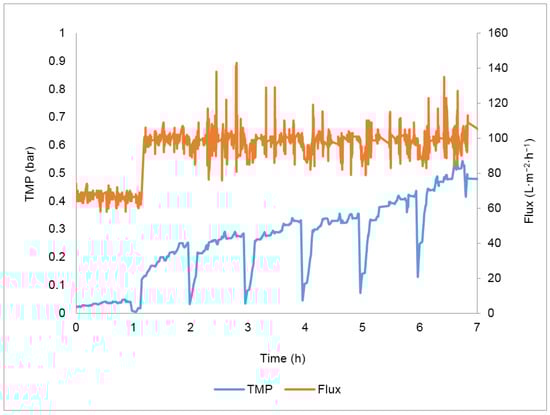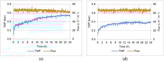 Figure 3 shows the TMP variation in the different 24 h assays conducted with the chosen permeate flux (67 L·m−2·h−1) and different flux maintenance strategies (detailed in Table 3).