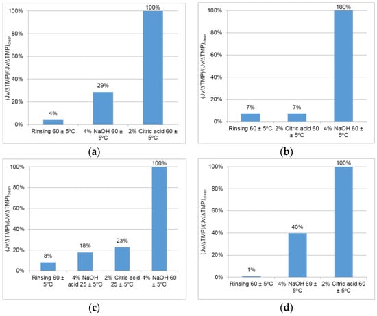 Percent recovery of the permeate flux per transmembrane pressure applied (Jv/ΔTMP)/( Jv/ΔTMP)clean with different cleaning protocols performed after the membrane filtration assays: (a) test 1; (b) test 2; (c) test 3; (d) test 4.
