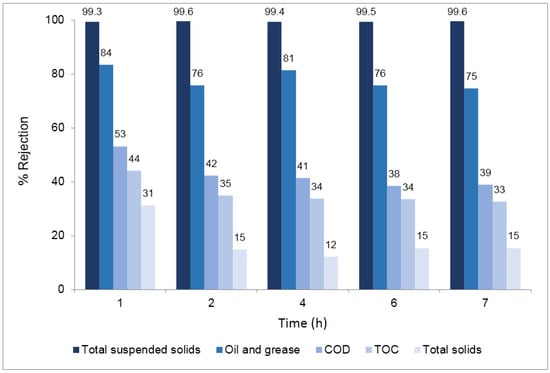 Results show that the rejections of the different parameters monitored were maintained during the 7 h concentration study, evidencing that the quality of the permeate over time was not deteriorated despite the increasing concentration of the different components in the feed wastewater due to the total recirculation of the retentate. The results obtained in terms of rejection were consistent with the results previously obtained in the 24 h total recirculation test. The silicon carbide membranes used ensure high removals of total suspended solids and oil and grease. The value of membrane resistance at working temperature due to fouling at the end of this test was 2.31 × 1012 m−1.