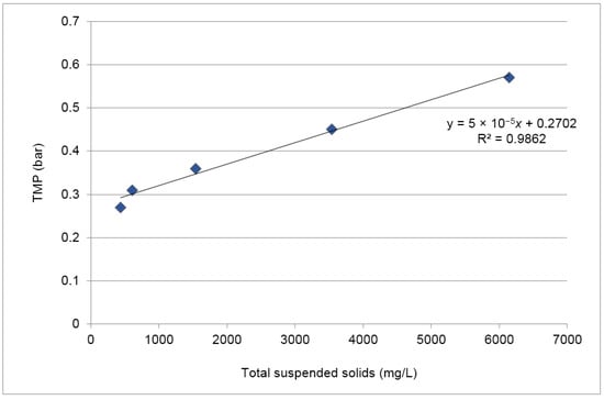 Figure 7 relates the maximum TMP achieved before backwashes with the concentration of total suspended solids present in the feed at the same time. A linear regression with a coefficient of determination (R2) of 0.99 was obtained, indicating a strong relationship between these two variables and confirming the influence of the concentration of total suspended solids present in the feed in the cake formation.