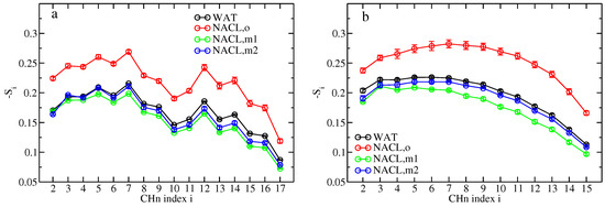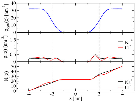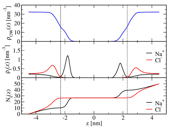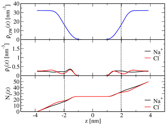 for chloride ions, where and are the number densities of sodium and chloride ions, respectively, along the z-axis of the system and is the location of the shear plane, defined as that distance along the z-axis where the water oxygen number density is equal to half of its bulk value. This choice is suggested from the profile of the average velocity of matter parallel to a charged bilayer exposed to an external electric field parallel to the bilayer [45]. and differ from the corresponding quantities in Equation (1) in that they refer to only one of the two bilayer leaflets. Therefore, the integration in Equations (19) and (20) can in principle be performed for the two leaflets of the bilayer, giving rise to two values for each of and , which, due to symmetry, are expected to be equal within the statistical error. Note that if and are used in Equation (1), has to be calculated as , and: