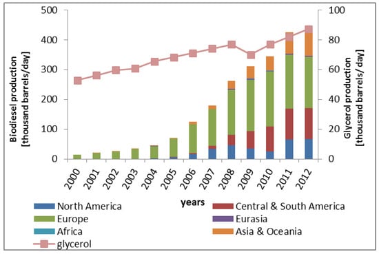 The need for replacing fossil fuels is driving the development of renewable fuels such as biodiesel. In the period 2000–2012, biodiesel production increased from 15 to 430 thousand barrels (Figure 1) [,,]. In the process of producing biodiesel from the transesterification of vegetable oils, glycerol (propane-1,2,3-triol) is produced as by-product. Typically, the production of 100 kg of biodiesel yields approximately 10 kg of glycerol, with purity of around 50%–55% [].
