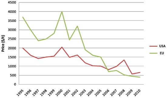The increased production of bio-diesel resulted in a significant fall of glycerol prices from 2000 to 2010 in the European Union (UE) and USA, as can be seen in Figure 2. In particular, the price dramatically decreased from about 3200 $/ton in EU and 2000 $/ton in USA to under 500 $/ton and 600 $/ton, respectively. This was mainly due to a new demand in developing countries as China, India, Russia and Latin American countries, where the glycerol was utilized as raw material in the personal care, pharmaceuticals and food and beverage sectors [,,].