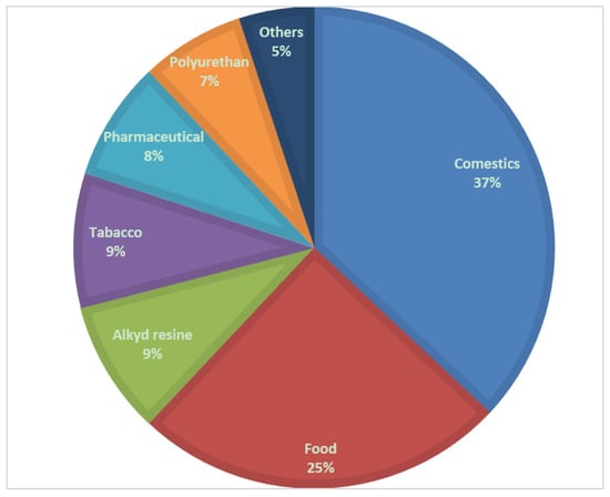 Currently, glycerol is mainly used as an intermediate chemical for the production of a variety of products [], such as cosmetics, food, pharmaceuticals, etc., as represented in Figure 3.