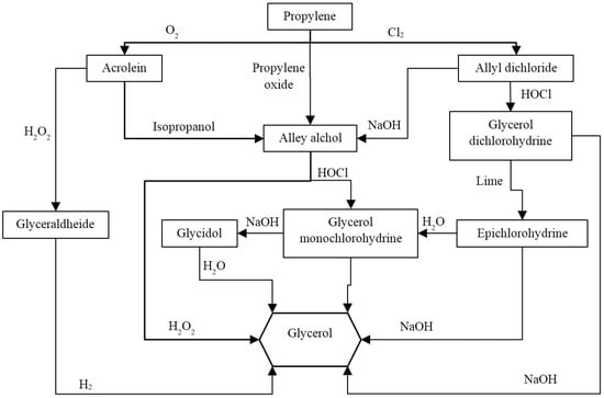 As stated before, several pathways can be used for producing glycerol by propylene [,] and Figure 4 sketches two of the principal pathways, which involve the use of O2 or Cl2.